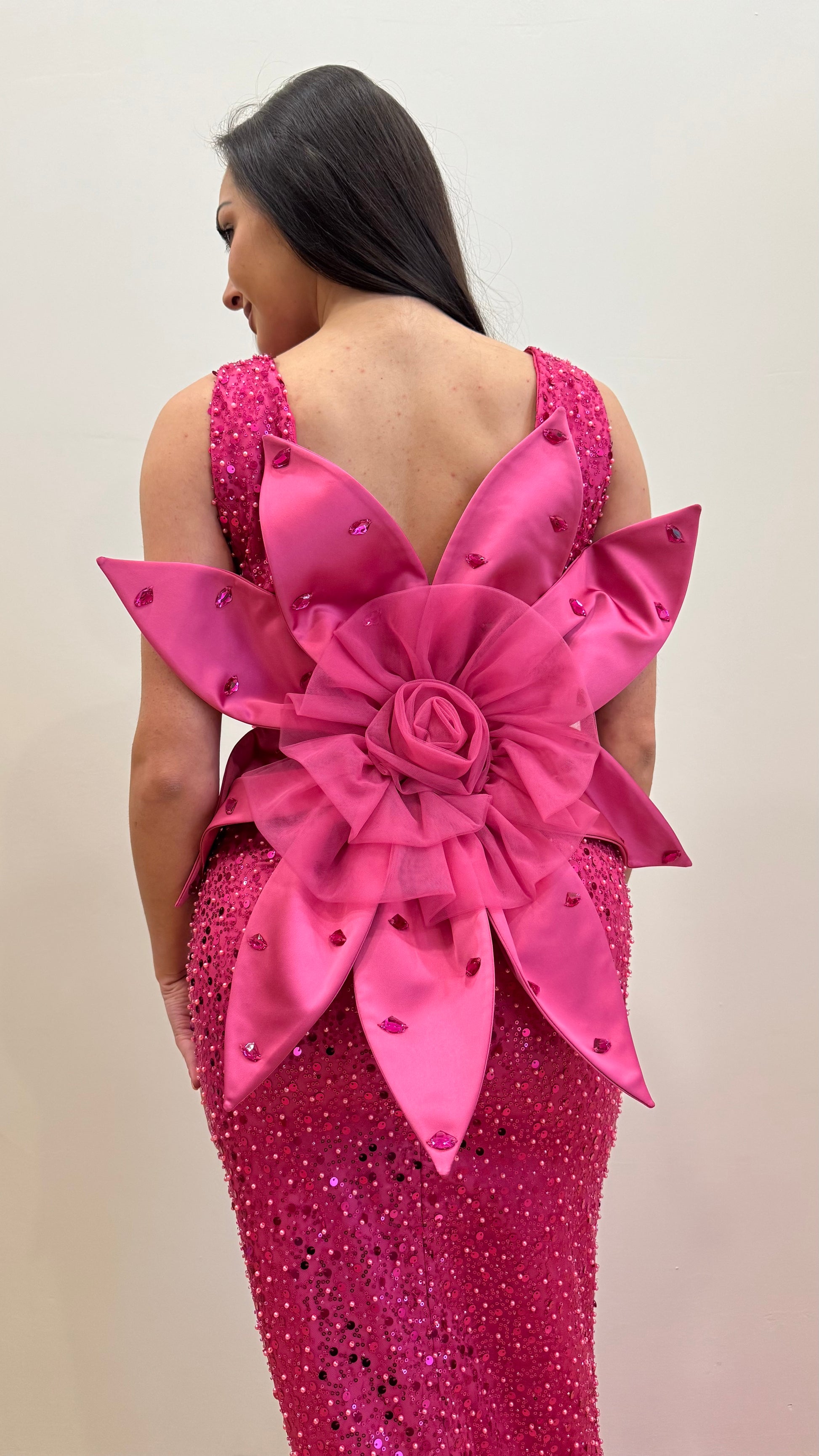 Un capolavoro di eleganza e femminilità pensato per lasciare il segno. Questo abito a sirena è realizzato in un prezioso tessuto ricamato con paillettes e perline fucsia, doppiato nella parte superiore per una struttura impeccabile. Il taglio all’altezza del ginocchio si apre in una ruota che, sul retro, si trasforma in una coda leggera e trasparente, creando un movimento scenografico e sofisticato. Il corpino presenta uno scollo rotondo e una profonda trasparenza frontale a forma di rombo, mentre il retro si distingue per una sensuale scollatura a V. A impreziosire il tutto, un maxi fiore applicato sulla schiena, realizzato in duchesse fucsia e tulle, arricchito da dettagli luminosi di gemme cucite a mano. Un abito d’alta moda pensato per le tue occasioni speciali, per brillare con stile e lasciare un’impronta indelebile.