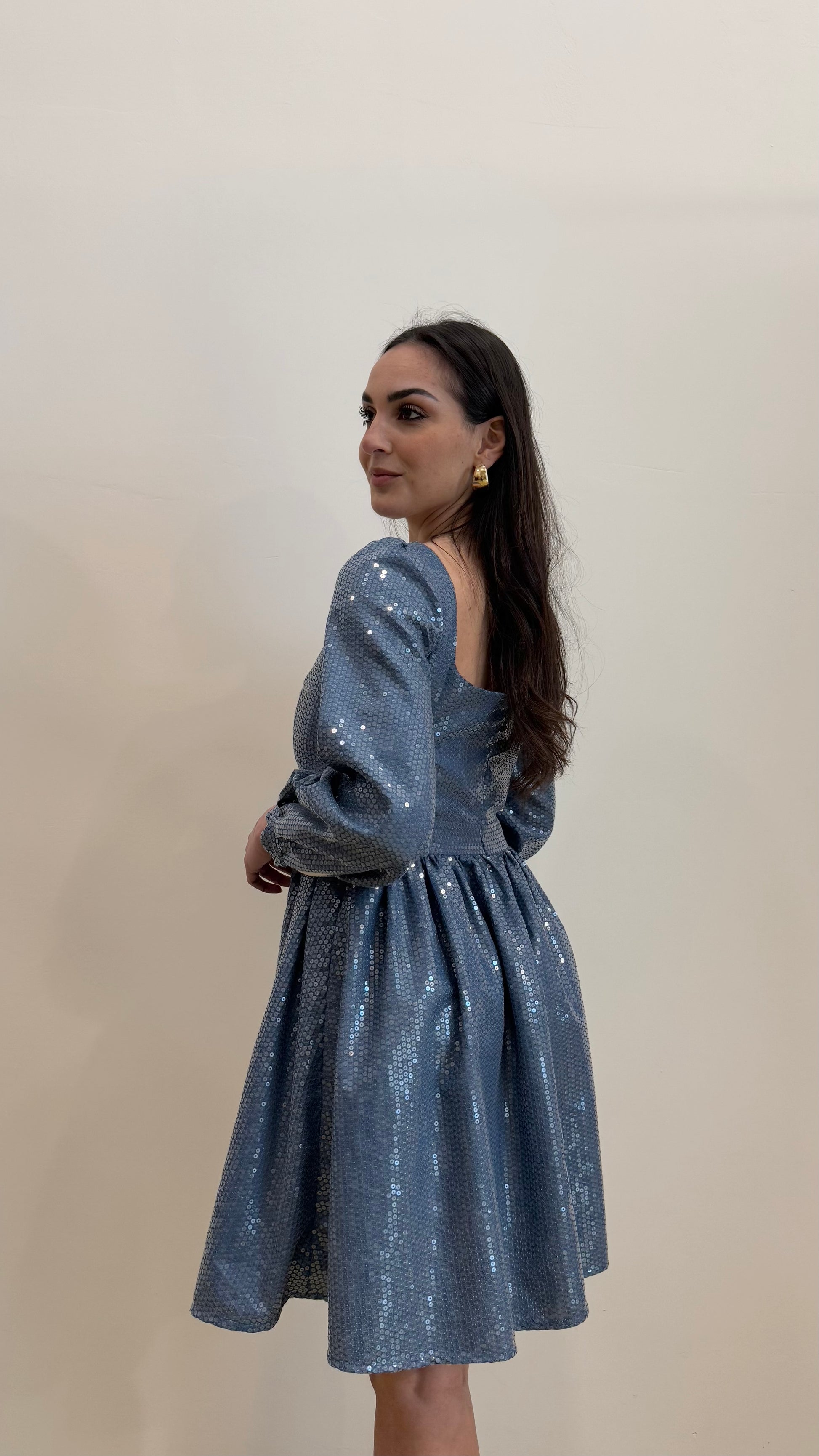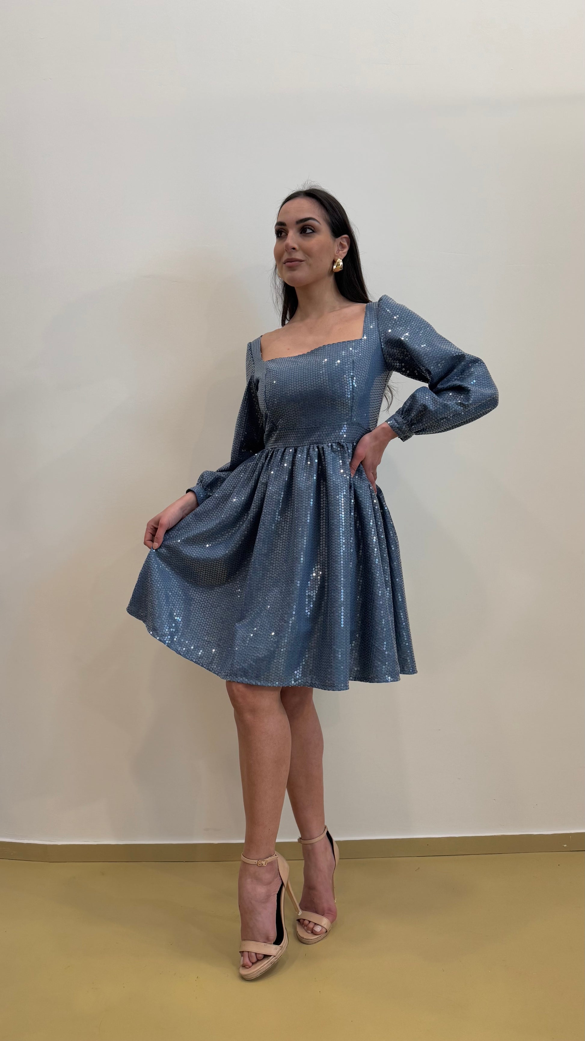 Un abito sartoriale dal fascino romantico e moderno, pensato per una donna chic e glamour che ama distinguersi. Realizzato in un raffinato tessuto in denim con micro paillettes trasparenti che riflettono la luce con riflessi delicatamente brillanti. La scollatura squadrata, presente sia sul davanti che sul retro, dona eleganza e struttura, mentre il taglio in vita con gonna arricciata crea un effetto bambolina, sbarazzino e femminile. Le maniche ampie, si stringono sul fondo con un polsino abbottonato per un tocco sofisticato. L’apertura sul retro è resa pratica grazie a una zip invisibile. Un abito unico, perfetto per chi vuole lasciare il segno con stile e luminosità.