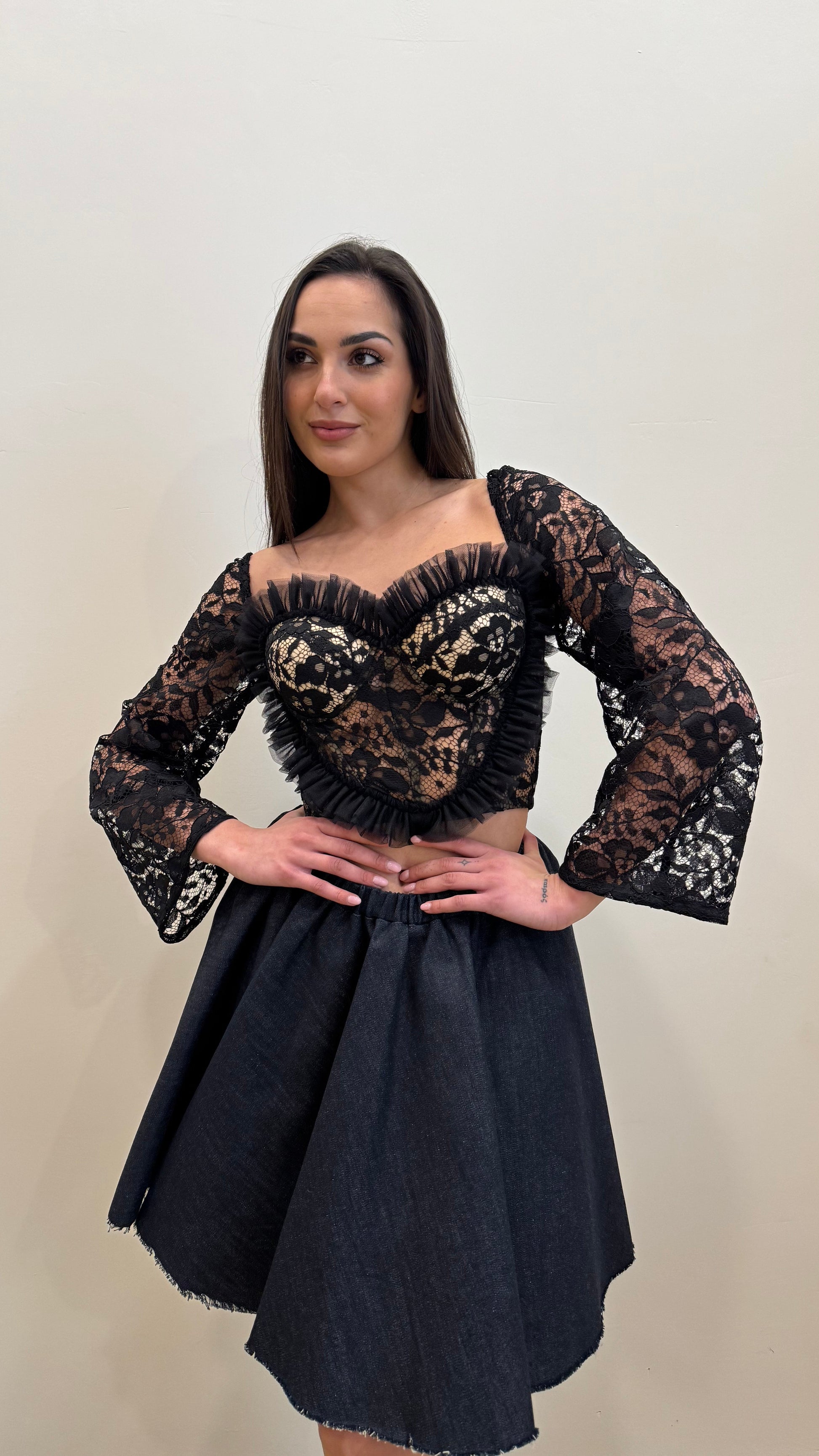 Un capo dall’allure romantica e sofisticata, questo corsetto sartoriale è realizzato in pregiato pizzo macramè nero, valorizzato da sensuali trasparenze che accarezzano la silhouette con grazia. Strutturato e rifinito con cura, termina elegantemente al punto vita e si chiude sul retro con asole e laccetti, richiamando l’eleganza dei bustier d’epoca. Sul davanti, un raffinato dettaglio di ruches disegna la forma di un cuore, per un tocco originale e profondamente femminile. Le ampie maniche, anch’esse in pizzo trasparente, aggiungono un senso di leggerezza e teatralità. Perfetto per occasioni speciali, serate romantiche o eventi esclusivi, questo corsetto è pensato per chi desidera sentirsi unica, elegante e indimenticabile.