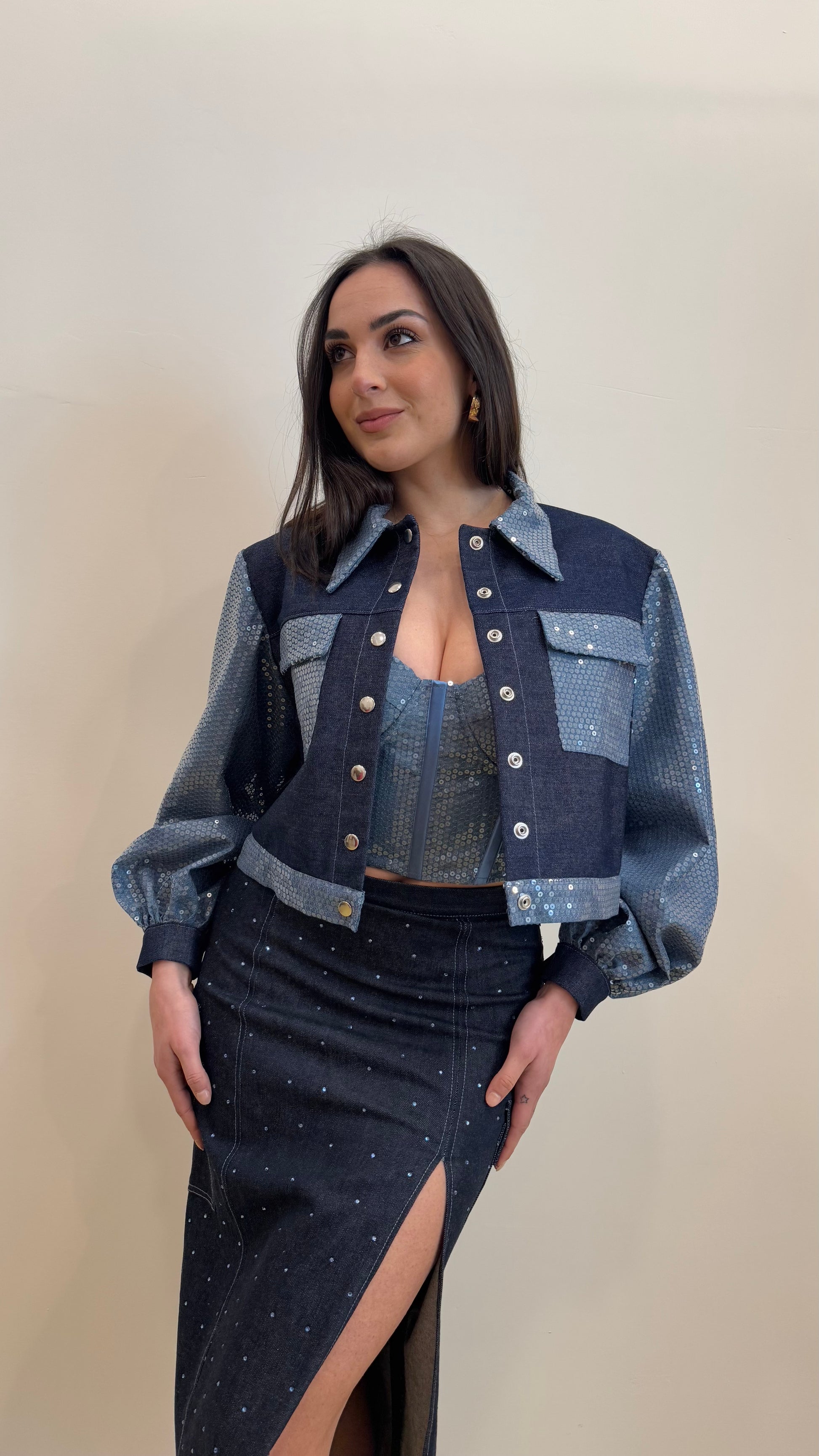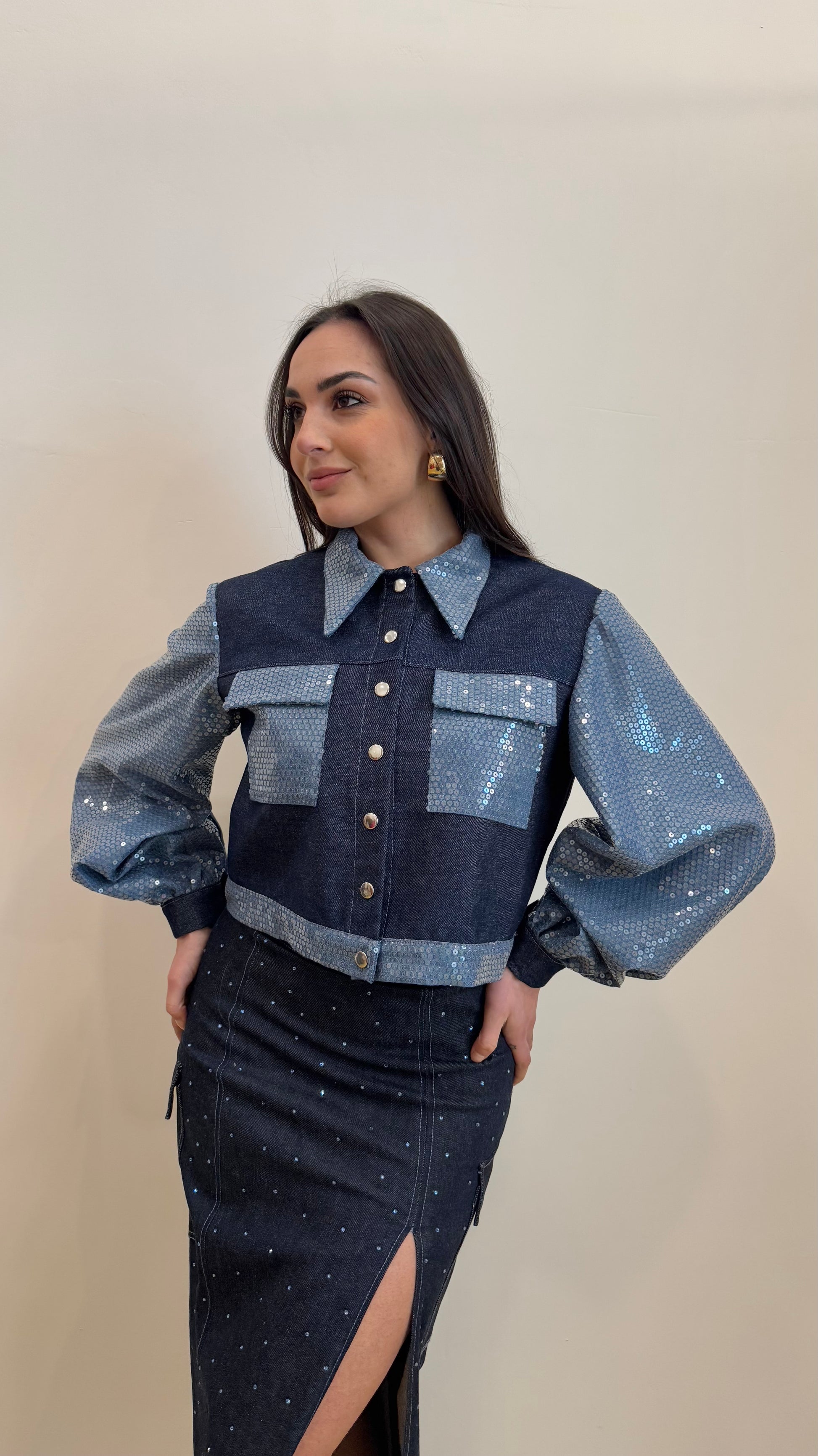 Giubbino sartoriale in denim blu, con maniche ampie e tasche realizzate in un particolare tessuto in denim ricamato con paillettes trasparenti, che riflettono la luce donando un tocco brillante e glamour. La vestibilità comoda e le ampie maniche, rifinite da un polsino, lo rendono perfetto per completare qualsiasi look con personalità e stile. Un mix equilibrato tra casual e glam, ideale per chi ama distinguersi nei dettagli.