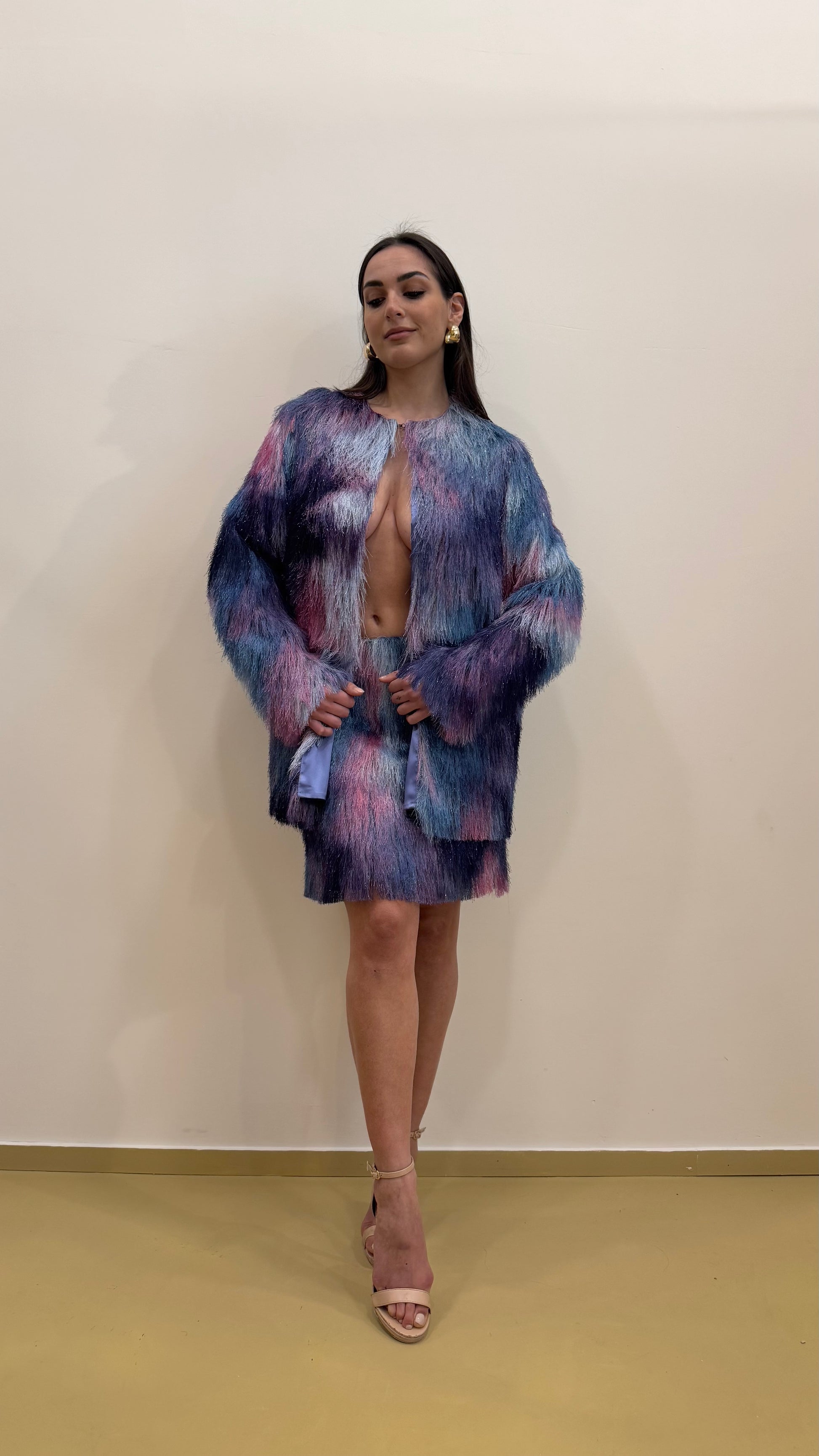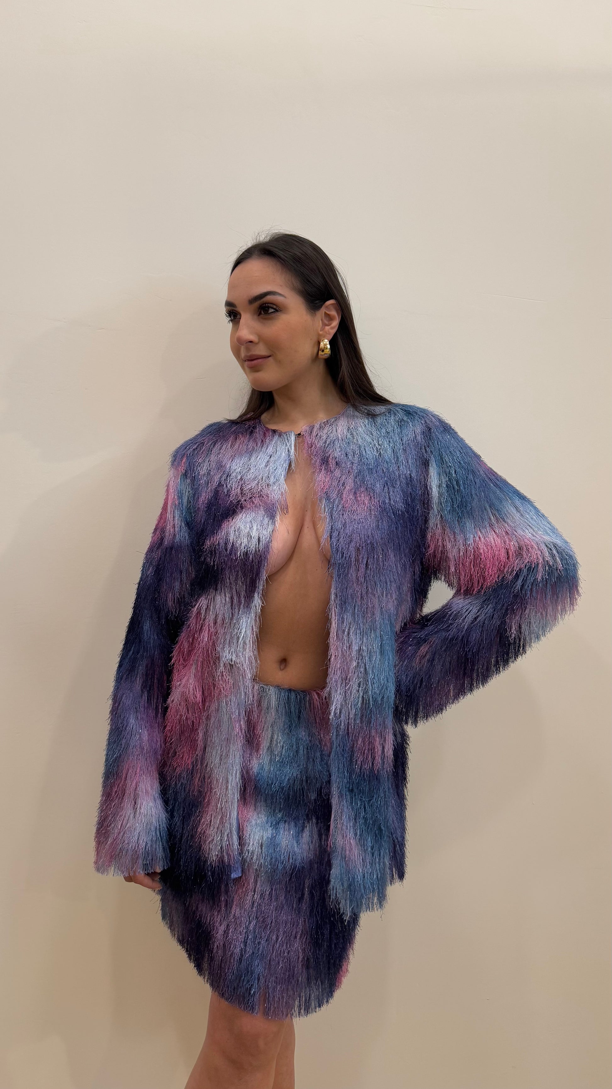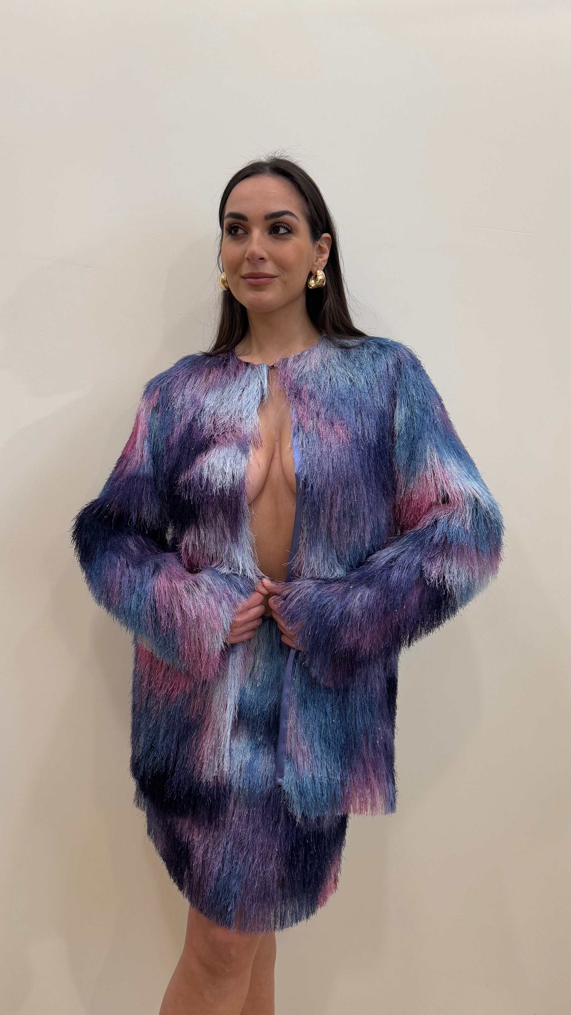 Un capospalla unico nel suo genere, pensato per una donna che ama osare con stile e personalità. Questo spolverino sartoriale è realizzato in un prezioso tessuto a frange, ricco di sfumature multicolor nelle tonalità del blu, azzurro e rosa e arricchito da fili lurex che donano luce e movimento al capo. Il taglio ampio e morbido abbraccia le forme con eleganza, adattandosi con naturalezza a diverse fisicità. Perfetto per completare anche gli outfit più minimal, è il capo ideale per chi desidera distinguersi con un’eleganza ricercata e fuori dagli schemi.